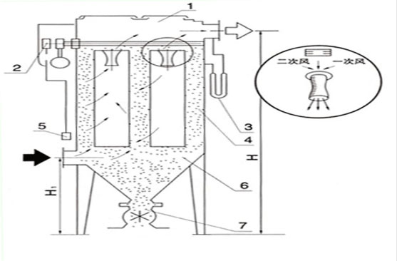 2、设备内部结构:由除尘室、集尘斗、反吹器和净化气流室四部分结构组成。